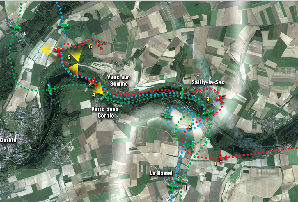 „1: Der Angriff. Ein Teil von Richthofens Geschwader, das sich von Osten entlang der Somme nähert, führt einen Angriff auf zwei britische Aufklärungsflugzeuge nordöstlich von Le Hamel durch. Die Deutschen werden von australischen Flakgeschützen beschossen. Browns Patrouille, die sich von Süden nähert, mit May auf der „sicheren“ Westseite, entdeckt den Rauch. Sie stürzen sich in den Angriff.