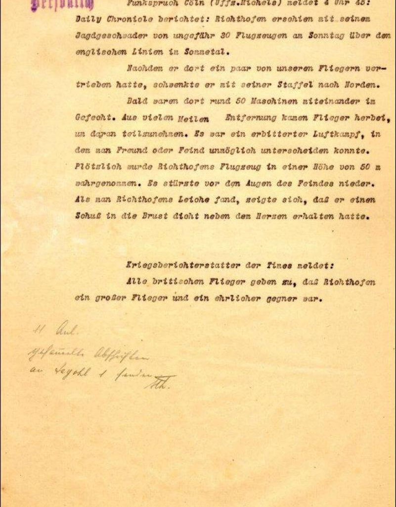Quelle: BArch PH 17-I/97 (Seite 5) „Durch das Gouvernement Köln erfuhr der Kommandierende General der Luftstreitkräfte am 22. April 1918 von der Mitteilung des „Daily Chronicle“ über Richthofens Tod im Luftkampf und der wohlwollenden Würdigung des gefallenen Gegners durch den Kriegsberichterstatter der „Times“.“