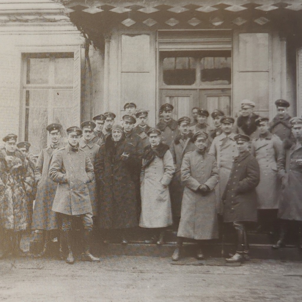 „Von Zeit zu Zeit wurden die Jasta-Führer zu Konferenzen einberufen, um die veränderten Umstände an der Front zu besprechen. Diese besondere Zusammenkunft fand in der Jastaschule in Famars statt. Richthofen ist der sechste von links in seinem Pelzmantel. Einige bekannte Gesichter sind zu erkennen, vor allem der hintere Offizier mit der hellen Mütze, 7. von rechts. Es ist Karl Bolle, der Kommandant der Jasta 2 Boelcke. Josef Mai von der Jasta 5 steht in der Tür, links.“