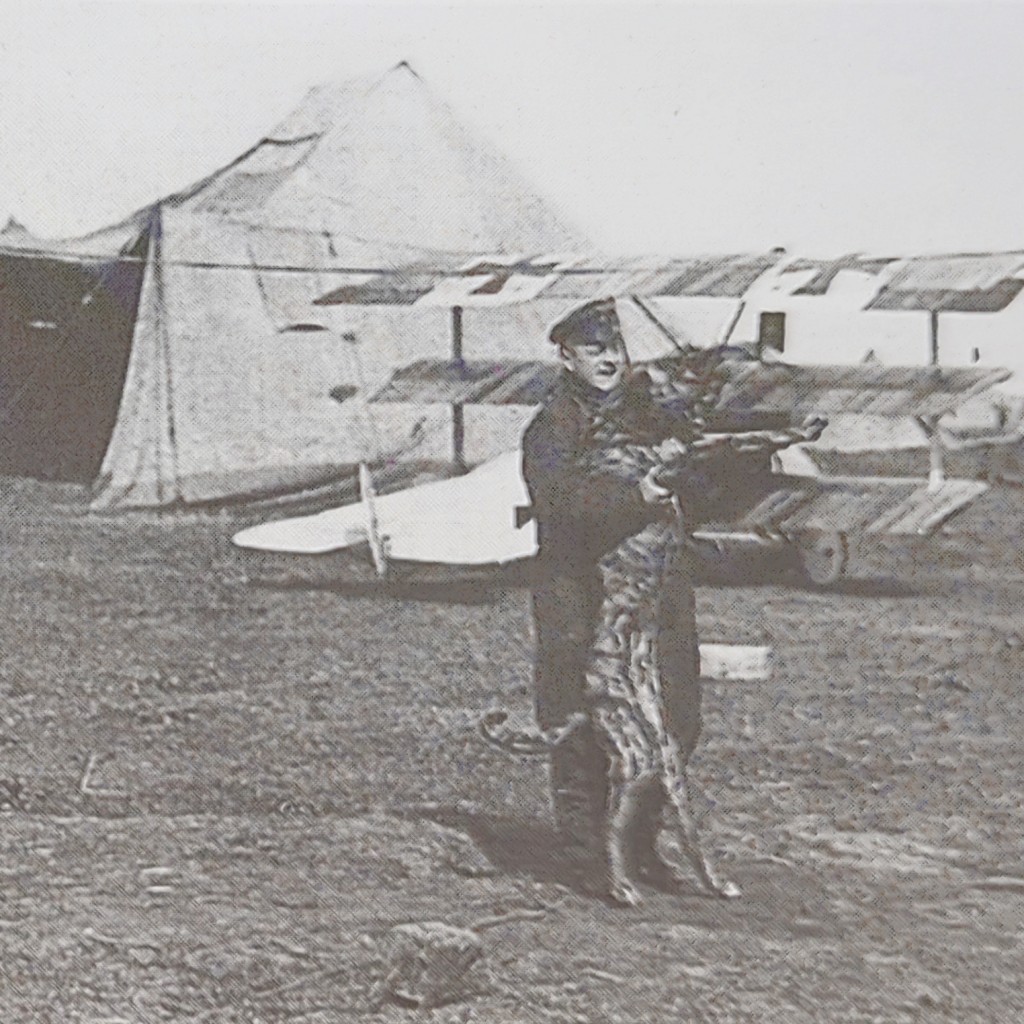 „Das Bild zeigt den Rittmeister von Richthofen mit seinem Hundmoritz und dem Geschwaderadjudant Karl Bodenschatz angeblich am 21. April kurz vor Richthofens letztem Start. In dem Buch ‚Richthofen- Flieger‘ von Richard Wenzel ist die Szene beschrieben, in der Kameraden dem Hund einen Bremzklotz an die Rute gebunden hätte (da Richthofen sie vorher geneckt hätte). Other sources claim this at Lechelle, with Leutnant Erich Lowenhardt.“