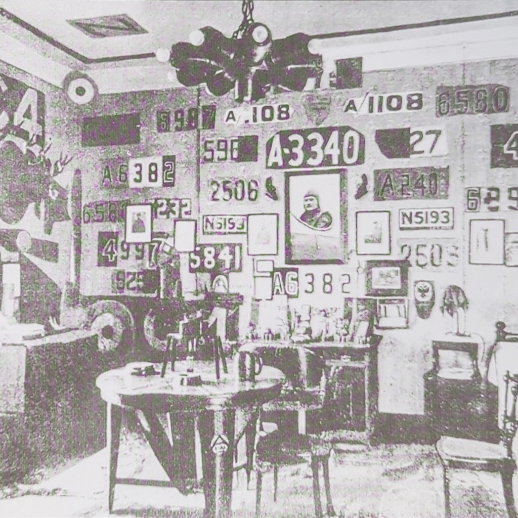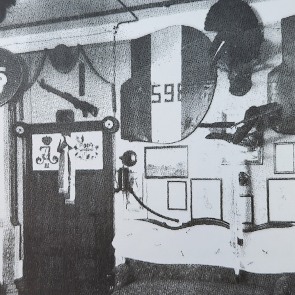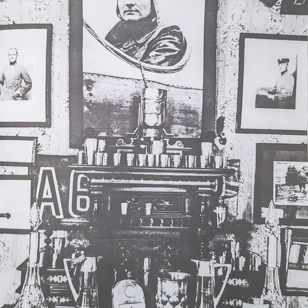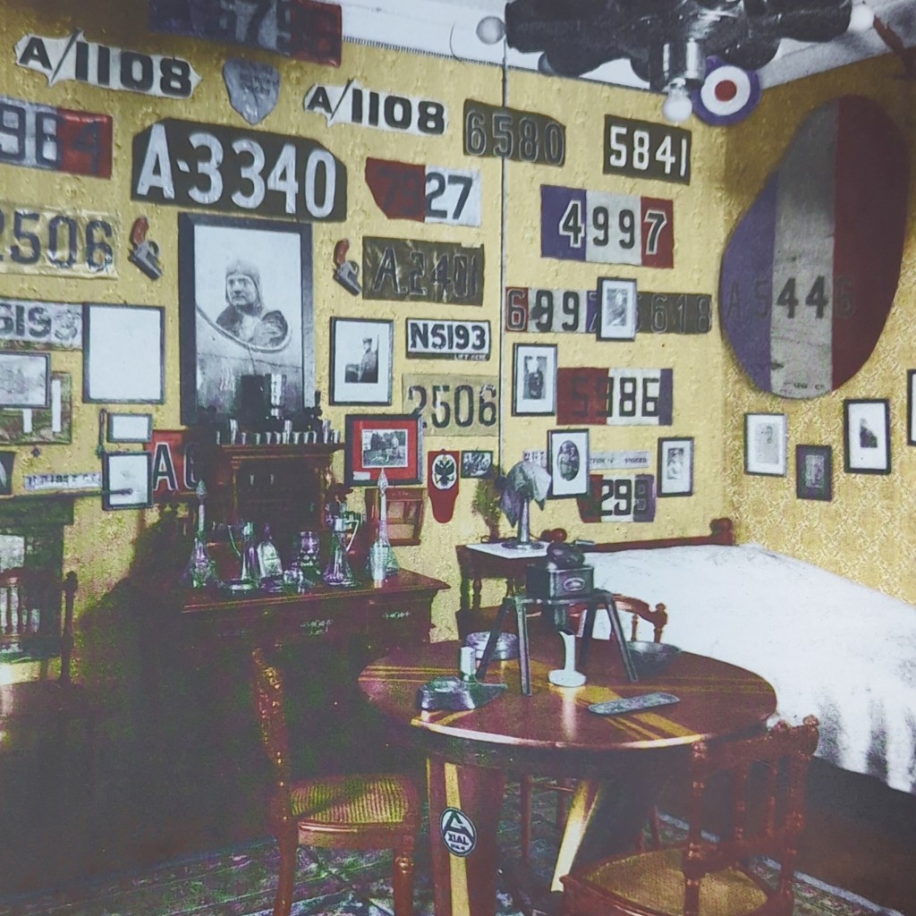 „Blick auf Richthofens Schlafzimmer in Schweidnitz, angeblich aufgenommen in den späten 1920er Jahren. Neben den verschiedenen Seriennummern, Rudern und Medaillons sind ausgestopfte Jagdtrophäen (linke Wand), die silbernen Siegespokale (hintere Wand, Mitte) und ein Tisch aus Axialpropellern (Mitte im Vordergrund) ausgestellt. Richthofens Bett steht ganz rechts. (Peter Kilduff)“