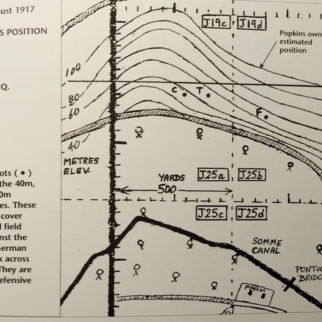 - Andere Quellen geben Standorte an (wie z.B. J.25.a.6.9), aber sie befinden sich auf nacktem Boden entlang der Straße Corbie-Vaux-sur-Somme, bis zum Wattenmeer. Das ist unlogisch: Höheres, bewachsenes Gelände befand sich direkt im Norden. Als diese Koordinaten auf der Karte vom August 1917 eingetragen wurden, fielen sie plötzlich an geschützten Stellen, insbesondere bei J.25.b.3.7 von Fraser in der Nähe von J.19.d von Popkin. Nicht jeder hat die neue Karte sofort erhalten.