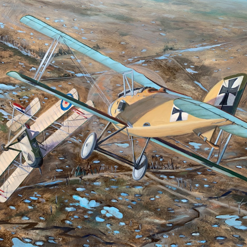 Ich machte weiter halbe Rollen und überquerte die Schützengräben in etwa 2.000 Fuß Höhe, wobei der Hunne mich immer noch verfolgte, und der Schurke trieb mich eine Meile westlich der Linien auf 800 Fuß herunter, als er nach Osten abbog und von unseren Flugabwehrgeschützen beschossen wurde. Ich behob schnell die Störung und wandte mich der Verfolgung des Hunnen zu, aber zu diesem Zeitpunkt befand sich der Hune bereits viel höher und schloss sich sehr bald seiner Patrouille an, die etwa 5.000 Fuß über Rancourt auf ihn wartete.“