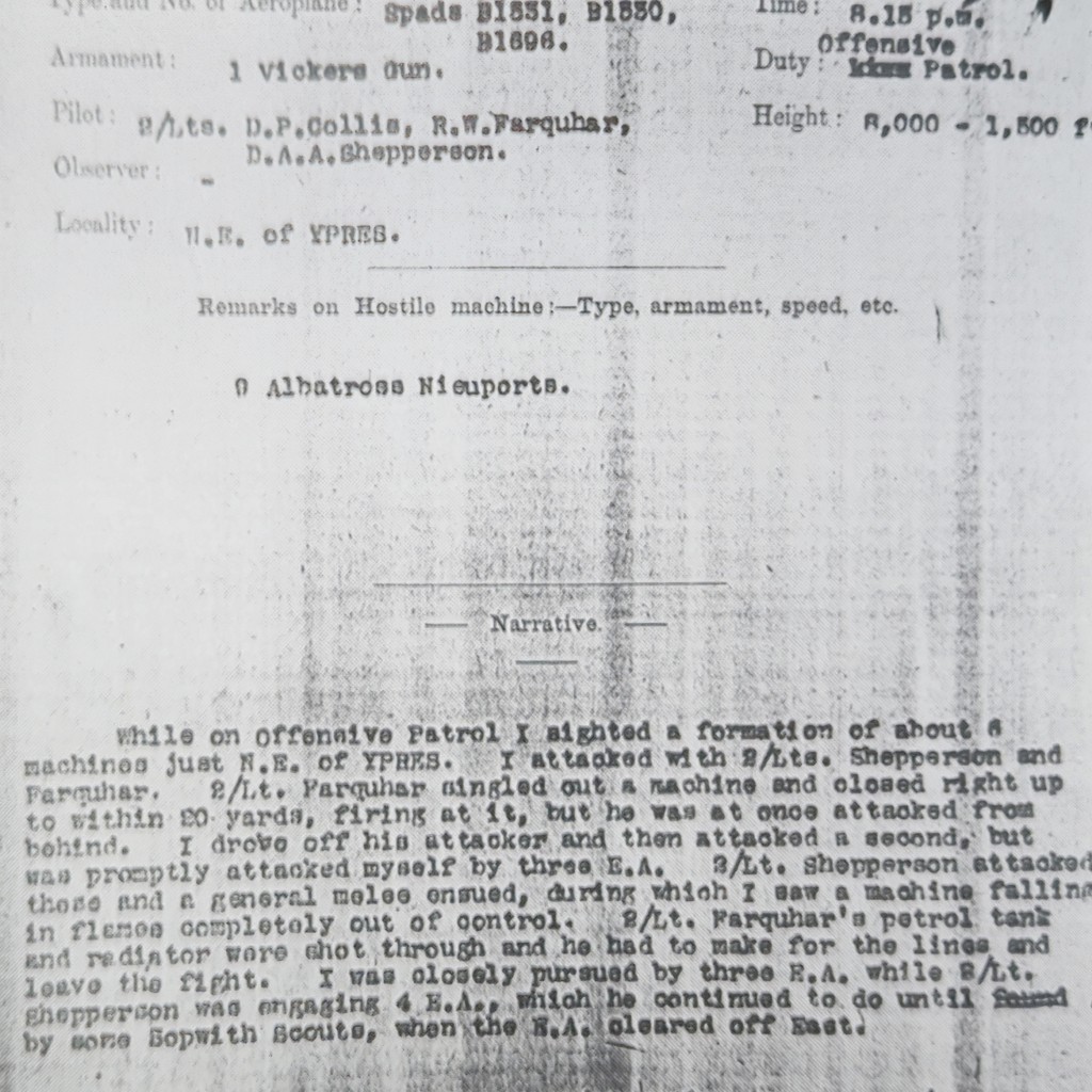 The exact manner of Farquhar’s downing is unclear. His Spad suffered engine and radiator damage, yet not enough for a damage report, and it is unknown if he force landed or was able to reach his base at La Lovie.