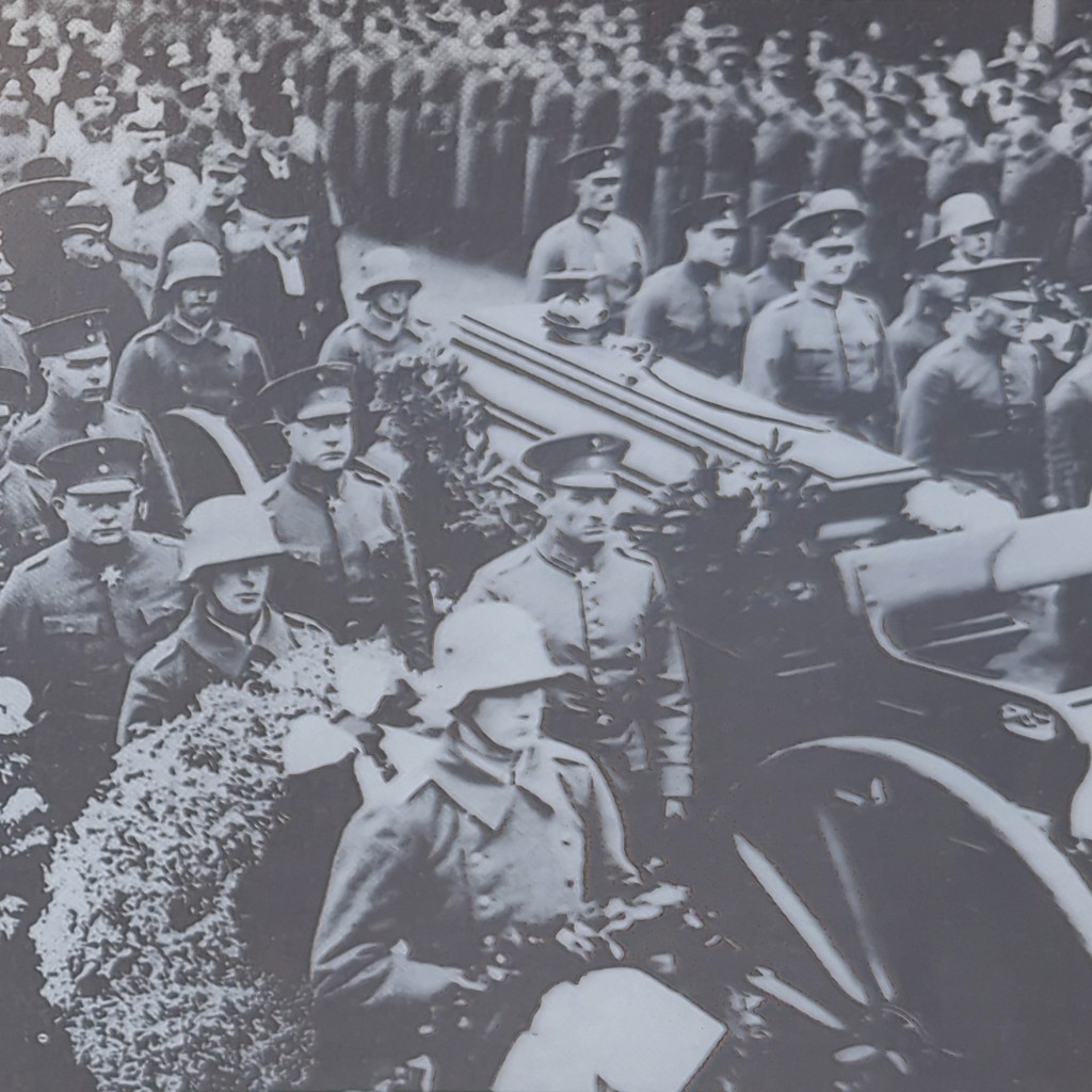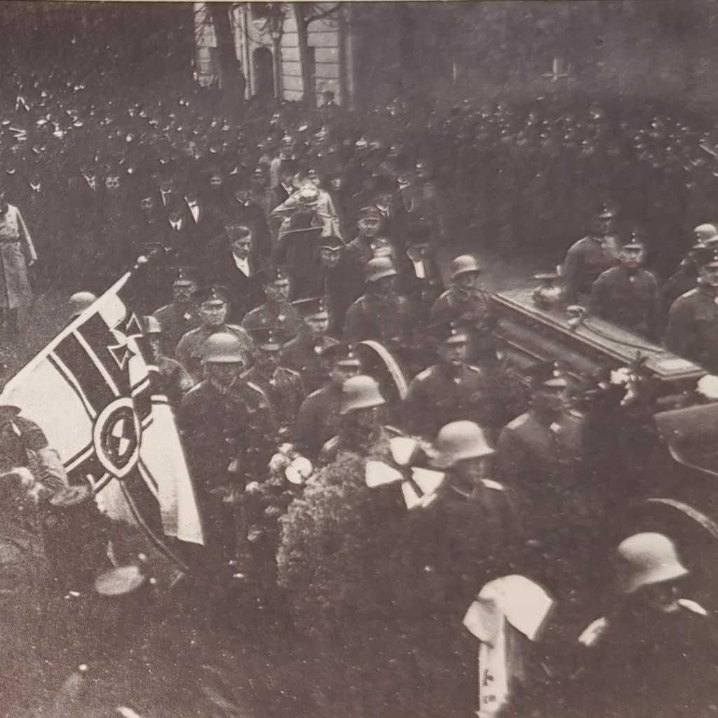 Bron: BArch RH 2/2288 (fol. 178) “Nadat de kist al op 16 november 1925 onder grote publieke sympathie per trein vanuit Kehl was vervoerd, kwam hij op 18 november aan op het station van Potsdam in Berlijn, waar hij ceremonieel werd ontvangen en onder verdere grote sympathie per auto naar de Gnadenkirche in de Invalidenstraße werd vervoerd, waar hij voor de talrijke voorbijgangers werd neergelegd. Op 20 november 1925 vond de begrafenis plaats op de begraafplaats Invalidenfriedhof. Na een korte ceremonie in de Gnadenkirche in aanwezigheid van Reichspresident von Hindenburg, Reichskanselier Luther, Reichsminister van Defensie Dr. Geßler, de chef van het legercommando generaal Seeckt en de chef van het marinekommando admiraal Zenker, trok de begrafenisstoet te voet over de Invalidenstraße naar de begraafplaats. De foto toont de familieleden in de begrafenisstoet na de kist, vooraan Richthofens moeder, Kunigunde Freifrau von Richthofen, achter haar de jongste broer Karl-Bolko, achter haar de zus Ilse. Reichspresident von Hindenburg en naast hem Reichsminister van Defensie Dr. Geßler zijn nog te zien aan de rand van de foto.”