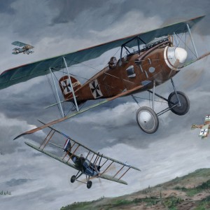 Perhaps the best known German fighter of World War I because it was flown by such aces as Manfred von Richthofen, the Dr.I was an indifferent performer in all aspects of air combat but climb and agility, in which it possessed almost legendary capability. The Dr.I was inspired by the Sopwith Triplane, but took the triplane formula to extremes in maximizing wing area while minimizing overall span. Designed by Reinhold Platz, the Dr.I had a rotary engine, steel-tube fuselage and virtually cantilever wings of wooden construction with ply skinning over their forward surfaces. The type entered service in August 1917, and 420 were built up to May 1918, by which time its low performance was a distinct liability in the hands of all but the most capable of pilots flying purely defensive sorties. (source: The International Encyclopedia of Aircraft, Oriole Publishing, 1991)